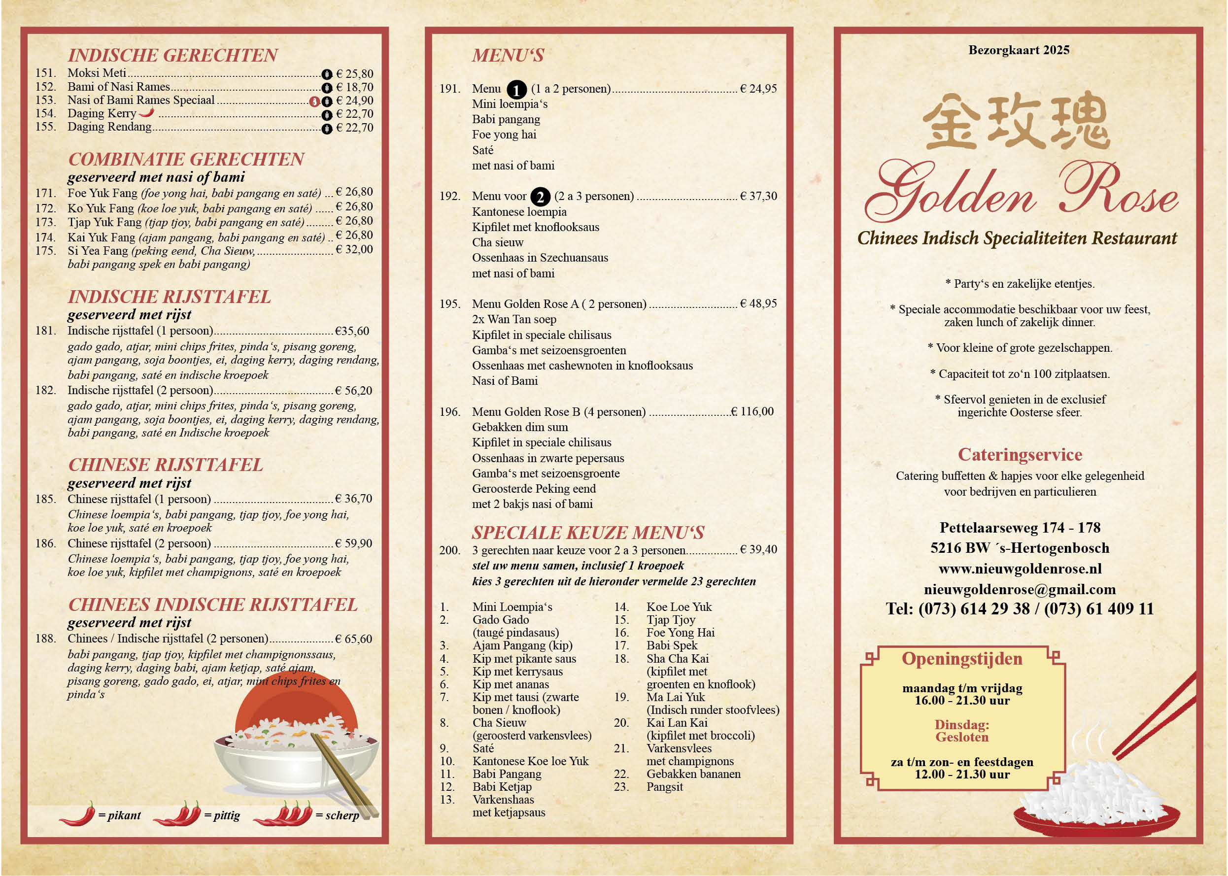 Het menu van Nieuw Golden Rose Op deze pagina vindt u onze menukaart. Onze kaart bestaat uit een mix van specialiteiten uit de Chinese en Indische keuken. Deze gerechten worden elke dag vers voor u bereid, wij werken uitsluitend met producten die voldoen aan onze kwaliteitseisen. Dit kunt u proeven, onze keukenbrigade weet iedere dag weer gerechten van hoogstaande kwaliteit voor u te bereiden. Heeft u vragen? Of is er sprake van bijvoorbeeld allergieën? Neem dan eens contact met ons op. Wij geven graag gehoor aan speciale wensen van onze gasten. Download menukaart